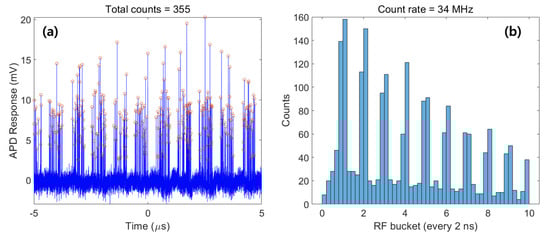 Under the PLS-II special operation mode, 300 electron pulses are injected into the consecutive rf-buckets while the rest of the remaining 200 buckets are unfilled. Figure 2a shows an oscilloscope trace of the X-ray pulses that are collected by the APD within 10 revolution clock cycles. The signal from the X-ray pulses striking the detectors is manifested as positive voltage peaks where the average pulse height corresponding to the detection of an individual 10 keV X-ray photon is 8.2 mV. Here, the peaks with an amplitude greater than 2.5 mV are identified with red circles and are counted as the registered photon events in post-processing. Figure 2b shows a histogram of the time gap between two successive X-ray pulses. This result demonstrates that the detector and acquisition system has the ability to resolve the timing of a single X-ray pulse at the count rate of 34 MHz, which corresponds to approximately one detected X-ray photon for every ten pulses. As shown in Figure 3, re-binning the histogram into individual buckets approximates the arrival time of the next photon as a continuous variable. The exponential distribution result implies that the photons are uncorrelated. This is expected since there is no coherent scattering (speckle) in this measurement.