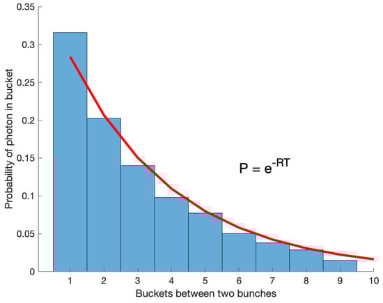 A binned probability distribution of photons per rf-bucket, which approximates the exponential distribution of a continuous random variable where R is the detected photon rate (34 MHz in this example) and T is the time between pulses, or 2 ns.