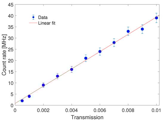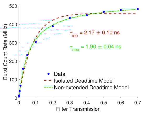 This model is shown in Figure 5 (dot-dashed green line) and shows a better agreement with the saturation curve data than the isolated model, indicating that the detector recovery time has a measurable but minor and correctable affect on the observed count rate at 500 MHz. The non-extended dead-time obtained from the nonlinear curve fit of the data is 1.90 ± 0.04 ns, just below the pulse separation time. Here, to analyze the high count-rate data sets shown in Figure 5, we perform a nonlinear curve fitting using Equation (1) on data and obtained an error of 0.1 ns. We note that the error bars in Figure 5 are too small to be seen due to the high count rate.