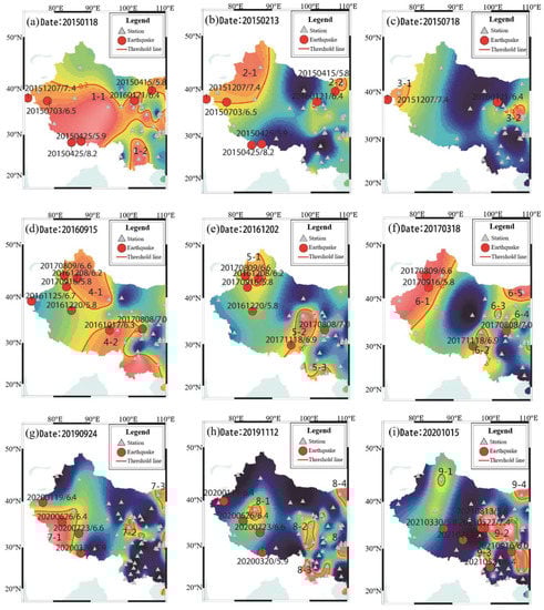 From January 2015 to December 2021, there were 18 geomagnetic vertical intensity polarization high-value anomalies in western mainland China [13], including nine anomalies over two or more anomalous regions. The spatial distribution of the nine anomalies is given in Figure 2 in the order of their occurrence.