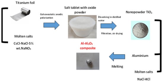 Titanium dioxide nanopowders were produced by electrochemical oxidation of titanium foil of 99.9 wt.% purity (“VSMPO-Avisma”, Ekaterinburg, Russia) in the chloride-nitrate melt according to the method described in detail elsewhere [,]. The interaction between molten aluminum and nano- and micro-oxide powders of titanium dioxide was performed in molten alkali halide media in an alumina crucible containing the mixture of alkali chlorides with a weighed portion of oxide additive. Salt mixtures of alkali chlorides with melting points lower than 700 °C, with small additions of some fluorides, were used as a base electrolyte with the concentration of titanium dioxide ranging from 0.2 to 2 wt.%. We used commercial “chemically pure” salts provided by “Lanhit” Ltd., Moscow, Russia.