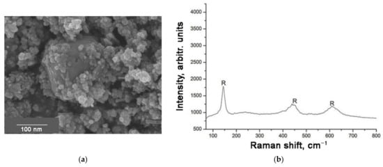 According to the results of the Raman spectroscopy of the sample obtained at 700 °C, peaks characteristic for the modification of rutile TiO2 were determined in the Raman bands: 144 cm−1, 448 cm−1, 612 cm−1 (Figure 2b).