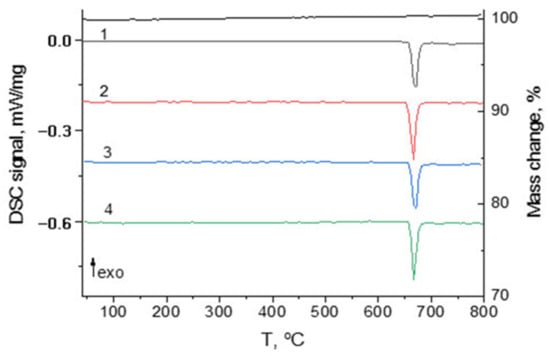 This phenomenon illustrates the property of peak reproducibility (Figure 7), which is a reflection of the reversibility of the phase transition during cooling and subsequent heating. The closeness of the value for the obtained composites to the parameters of the original metal can be primarily due to the indicators of the wettability of the dispersed oxide nanophase by aluminum. The data obtained by the thermogravimetry simultaneously with the differential scanning calorimetry also revealed that the thermal stability of the obtained composite materials was close to pure aluminum. The recorded change in the mass of the aluminum was equal to 0.74% and that in the composite samples during three heating and cooling cycles did not exceed 0.37%. Such an insignificant change in the mass of the sample during measurements, accompanied by the appearance of lines attributed to endothermic anomalies during DSC, directly indicated the presence of the process, which is a first-order phase transition with a high reproducibility index.