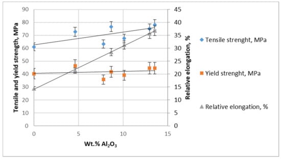 It is evident that the yield strength did not increase with the increase of nano-α- alumina content up to 14 wt.% in the composite (Figure 10). This is in opposition to conclusions drawn in [] that the increase in tensile strength was observed only up to α-Al2O3 concentrations of about 5 wt.% and the tensile strength decreased at other concentrations. The composites with an addition of 7–14 wt.% of α- Al2O3 possessed tensile strengths of 67.56 and 78.16 MPa, which were 1.10 and 1.27 times greater than that of the aluminum matrix sample (61.38 MPa). As can be seen from Figure 8, a further increase in the content of aluminum oxide in the composite to 19 wt.% neither improved, nor worsened, the mechanical properties of the composite. Thus, it can be considered that the aluminum oxide concentration of 14 wt.% was optimal from the point of view of the combination of all properties.