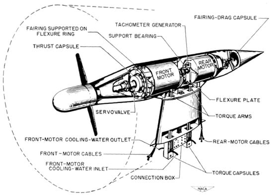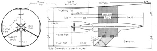 Examples of large wind tunnel propeller dynamometers are typically found in government and industry. Boldman et al. ([19]) described a dynamometer used in the United Technologies Technology Research Center: a 10 ft by 15 ft large subsonic wind tunnel used to evaluate an advanced ducted propeller. National Aeronautics and Space Administration (NASA) facilities have been previous described, including a 2000 hp dynamometer at NASA Langley used in a 16 ft, high-speed wind tunnel ([20]), shown in Figure 2, and a 1000 hp dynamometer at NASA Ames used in a 12 ft wind tunnel ([21]), shown in Figure 3. The propeller diameters used in these NASA facilities range from 4 ft to 10 ft and are roughly one half to one third of the test section size. Further, the propellers are located between one half to two diameters ahead of the vertical strut. In order to collect credible propeller performance data, it is important for wind tunnel dynamometers to be designed to reduce fluid–structure interaction between the propeller flow-field and the wind tunnel test section and dynamometer vertical support.