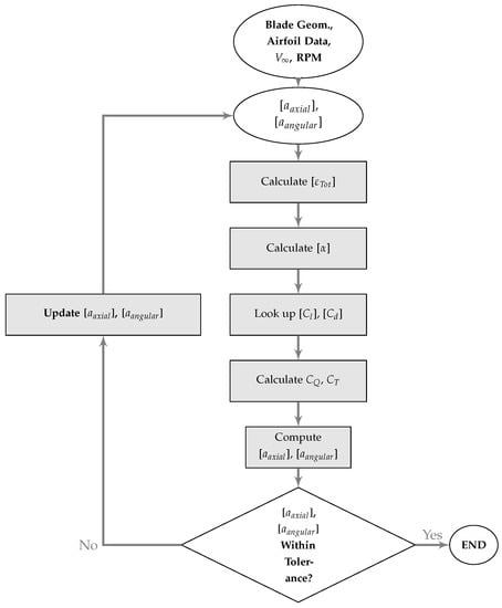 Blade Element Momentum Theory (BEMT) is a common methodology for predicting propeller performance in terms of the coefficients defined in Section 1.4.1. BEMT requires only a few inputs. The code implemented for this research is described succinctly by the flowchart presented as Figure 4, and is similar to examples found in [22,23,24,25].