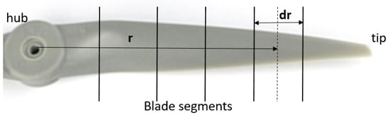 The first step in the BEMT solution process is to discretize propeller geometry for analysis. Input files catalog propeller twist and the local airfoil profile for n radial segments, specified by distance from the hub (r), each of length , from the hub to the tip. The measurements describing propeller geometry specification are shown as Figure 5.