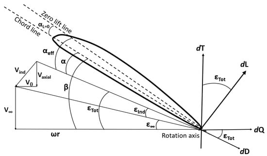 Next, with the total downwash angle defined, the local lift and drag coefficients for the airfoil sections can be determined. For each blade segment, the effective angle of attack is the sum of the geometric angle of attack (AOA), and zero-lift AOA, . The geometric AOA is defined in Equation (8), where is the geometric pitch angle
