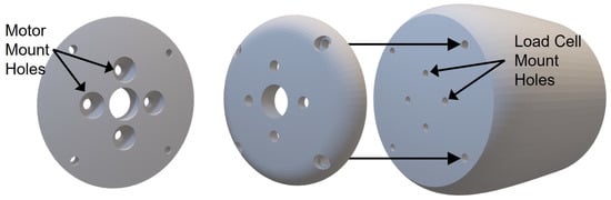 A Honeywell SS460S Hall-effect sensor is epoxied inside the motor to detect shaft speed. A Futek MBA500 torque and thrust bi-axial load cell is mounted between and inline with the drive motor and dynamometer horizontal support, using custom-designed and 3D-printed cowling components, as shown in Figure 7 and Figure 8. The inline arrangement is an improvement over the previous OSU dynamometer design, minimizing the effect of vibrations that can be experienced with an offset, moment-arm arrangement. The load cell has a 50 lb thrust limit and 50 in-lb torque limit with an error of 0.25% of read-out.