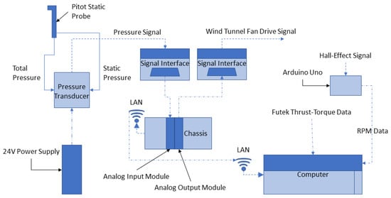 The dynamometer is in operation at Oklahoma State University in the Advanced Technology Research Center (ATRC). The wind tunnel has a 125 hp draw down drive motor. The test section has a 3 ft by 3 ft area. The wind tunnel has a pitot-static probe positioned at the entrance of the test section, 18 in from the bottom of the test section. The pitot-static probe is 3 ft from the propeller rotational plane on the propeller dynamometer, and it is plumbed to an Omega differential pressure transducer with a 0.072 psi range. The pressure transducer is driven by a 24 V, 10 A National Instruments (NI) power supply. The transducer signal passes through a Phoenix Contact interface module that converts the wired signal to a D-SUB port. The signal is then sent into an NI analog input module. This analog input module is attached to an NI 8-slotted chassis that compiles the signals received and transmits the data to a Dell Precision Tower 5810 computer. This computer also uses the same NI chassis for sending signals to drive the wind tunnel fan through an NI analog output module and a corresponding Phoenix Contact D-SUB interface.