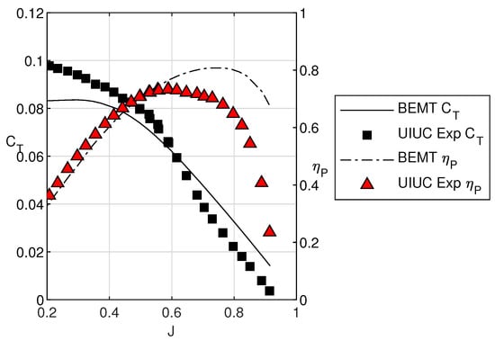 Figure 12 shows experimental results from UIUC for a 14 × 12E APC propeller compared to those from the BEMT code. The plot for BEMT and UIUC experimental results includes thrust coefficient and propeller efficiency as a function of advance ratio at 3500 RPM [27]. The results are in close agreement in terms of propeller efficiency up to an advance ratio of 0.6. The BEMT code under-predicts thrust coefficient by as much as 15% for advance ratios below 0.3. In general, the BEMT results are more reliable than the APC published performance in the previous figure. Though the BEMT results are only reliable for validating performance over advance ratios of 0.3 to 0.6, they capture the general trends beyond that range, including the slope of the thrust coefficient for advance ratios between 0.6 and 0.8 and the rapid drop in propeller efficiency at an advance ratio of about 0.8. The other main take-away is that the BEMT code used in this study is indeed properly applied, acknowledging that the analytical model is not expected to capture complicated viscous flow effects at high and low advance ratios where the blade experiences very low and high relative angles of attack. Discrepancies may also possibly result from experimental uncertainty and airfoil aerodynamic data that does not capture three-dimensional flow effects.