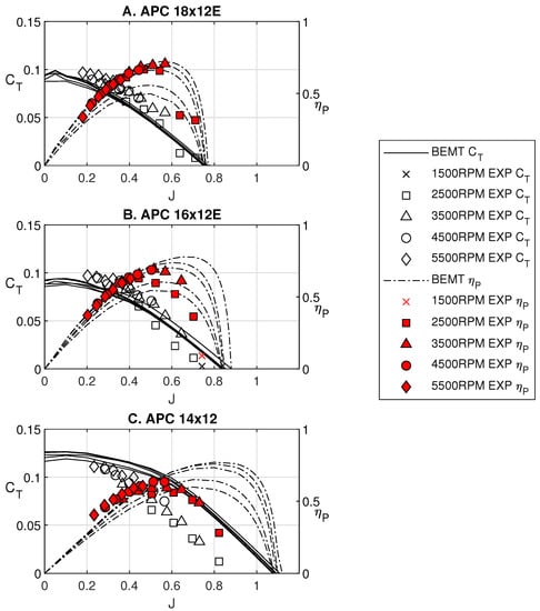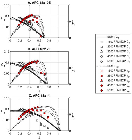 BEMT and experimental and for APC propellers 18 × 10E, 18 × 12E, and 18 × 14.