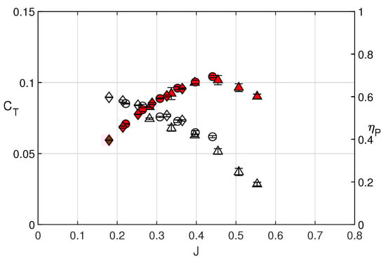 Propellers are characterized by the amount of torque and thrust they produce at a given shaft speed, and by the ratio of the power transferred to the air versus the mechanical power supplied, known as propeller efficiency [10,11,14]. As is typical in aerodynamics applications, the dimensional thrust and power are not typically specified; rather, non-dimensional coefficients are presented to allow the end-user of the data to adapt the results to their application (i.e., operating with a different atmospheric density or at a different velocity). Unlike aircraft wing aerodynamics, which are non-dimensionalized using freestream velocity, propeller performance coefficients are based in the propeller frame of reference, using chord-wise velocity at a given radial location as a function of both freestream and rotational velocities.
