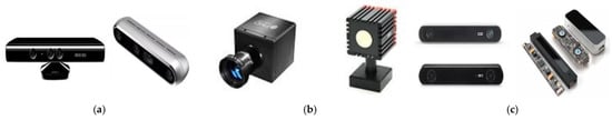 The three-dimensional reconstruction technology of the RGB-D camera mainly includes the acquisition of RGB image and depth image, image data preprocessing, point cloud registration and fusion, and its ability to transform a real scene into a mathematical model that conforms to the logical expression of computer. At present, the commonly used RGB-D cameras mainly include the structured-light [17] depth camera (Figure 1a), which emits light with feature points to objects with smooth surfaces and no features, and assists in extracting the depth information of objects according to the three-dimensional information in the light source; the time of flight (TOF) [18,19] depth camera (Figure 1b), which obtains the distance by measuring the interval of flight time between the transmitted signal and the received signal on the premise of a certain speed of light and sound; and the binocular stereo [20] depth camera (Figure 1c), a passive depth perception method that simulates the principles of human vision.
