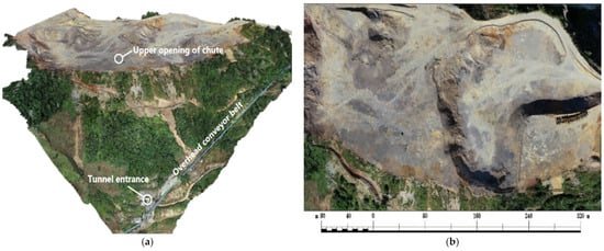 Overview of the study area. (The model is constructed by tilt photogrammetry). (a) Overall view of the mine; (b) Front view of the mining part of the mine.