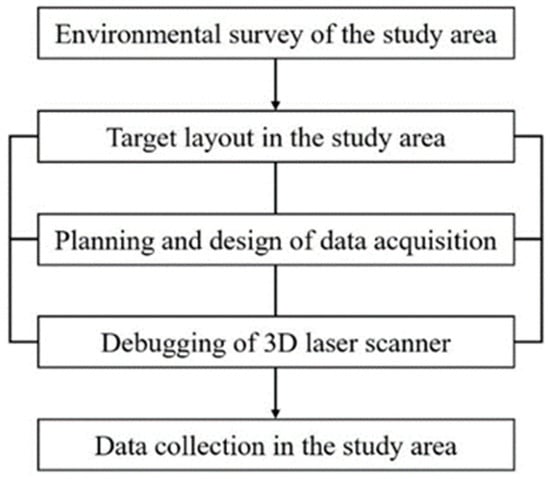 In this paper, the Maptek I-site 820ER 3D laser scanner of MAPTEK was used to collect 3D point cloud data. The flow chart of point cloud data acquisition is shown in Figure 4. Without the interference of metal minerals and the magnetic field, the maximum range of observation is 750 m, the minimum range is 1 m, the scanning range is 125° vertically and 360° horizontally, and the repeated ranging accuracy is ±6 mm. A high-resolution panoramic camera is also available to obtain point cloud texture information. Its powerful and comprehensive performance enables complex surveying and mapping tasks, such as underground mining engineering.