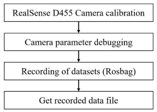 There are various RGB-D cameras, and the Realsense depth camera [23] is highly integrated with a low cost, and it can be applied in both indoor and outdoor scenarios. Its ideal measurement range is 0.6 m to 6 m, and the depth accuracy reaches 4 m < 2%. Therefore, the Realsense D455 depth camera was used in this study to measure the depth by classical binocular vision and binocular vision ranging assisted by an infrared projector. The data acquisition flow chart is shown in Figure 6.