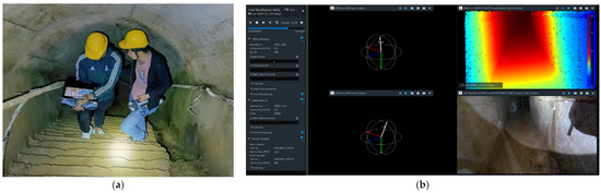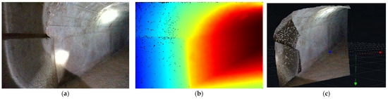 After the depth cameras were calibrated, the data connection cable was connected to the computer and the handheld depth camera was used for data acquisition. The Rosbag dataset was recorded for the access shaft roadway through the Intel Realsense SDK depth camera control software, and finally, an offline dataset package was obtained, as shown in Figure 7. Each frame of the 2D color image and synchronous depth image of the recorded access shaft roadway can be obtained in the data package, and the unprocessed color 3D point cloud can also be obtained directly.