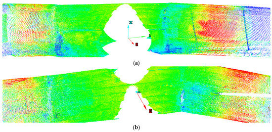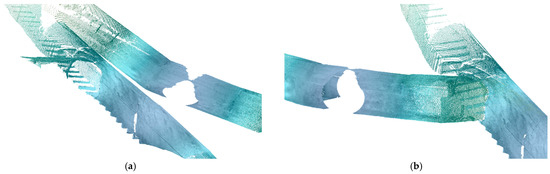 Due to the large and narrow slope of underground tunnel shaft, it was dangerous to install the total station and difficult to layout the target; thus, we selected the point cloud registration without a target. The most basic target-free point cloud registration algorithm is the Iterative Closest Point (ICP) algorithm [26]. Its processing flow is to collect samples from the original point cloud data, determine the point set corresponding to the initial matching, filter and screen the corresponding point pairs, and solve the transformation matrix. Maptek I-Site Studio software was used to register the cloud data of each scanning survey site of the underground shaft roadway based on the ICP algorithm. The results are shown in Figure 9. After registration in Figure 9b, it is evident that the 3D laser point cloud is obviously missing.