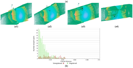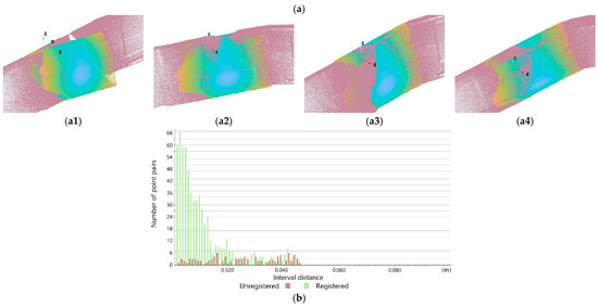 (a) Point cloud patching diagram of ISS + ICP algorithm. (a1) Initial pose; (a2) Coarse registration; (a3) Fine registration side view; (a4) Fine registration top view. (b) Fine registration verification diagram.
