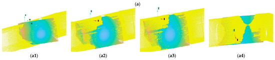 We collected the same coordinate values of feature points for the two types of processed point cloud data respectively, calculated the three-dimensional space distance through the coordinate values of the two feature points, and measured the relative distance of the roadway vertical section from different point cloud data at the same position of the shaft. The smaller the three-dimensional distance difference, the higher the accuracy, and vice versa. The coordinates of three-dimensional feature points are shown in Figure 12. By measuring the distance between feature points, the maximum error was 2.617 cm and the minimum error was 0.031 cm, which can meet the visual repair of the missing part of 3D laser scanner data acquisition.