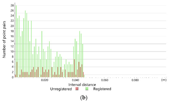 The fast point feature histogram (FPFH) is an improved algorithm based on point feature histogram (PFH) [31] which refines the original algorithm and improves its computational efficiency. The process of the algorithm is to provide a fixed neighborhood interval for a certain geometric feature in the point cloud, calculate the geometric eigenvalues of the point cloud through the neighborhood interval, establish a histogram of the eigenvalues for statistics, and then obtain a statistical feature. After the corresponding point pairs of the target point cloud and the source point cloud are obtained according to the FPFH algorithm, the optimal transformation matrix is obtained through iterative calculation so that the pose of the target point cloud and the source point cloud is relatively accurate. The ICP algorithm is used for fine registration and the source point cloud data is repaired. The RGB-D roadway point cloud and the 3D laser scanning point cloud were repaired by FPFH + ICP algorithm; the RMSE value was 19.0657 mm and the repair results are shown in Figure 14a,b.