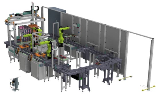 SmartFactory is a classroom, within a new CPIT TL3 building, specialized in Industry 4.0 technologies such as modern manufacturing processes, robotics, and automation, and a fully automated production line is also located there. This production line contains a digitized production process with Industry 4.0 elements such as product variability, predictive maintenance, augmented reality, or digital twins. The 3D model of the SmartFactory production line can be seen in Figure 5. Here, two types of products are manufactured in a fully automated process. The line enables product assembly using a fully automated process, product testing, product inspection, and product layout.
