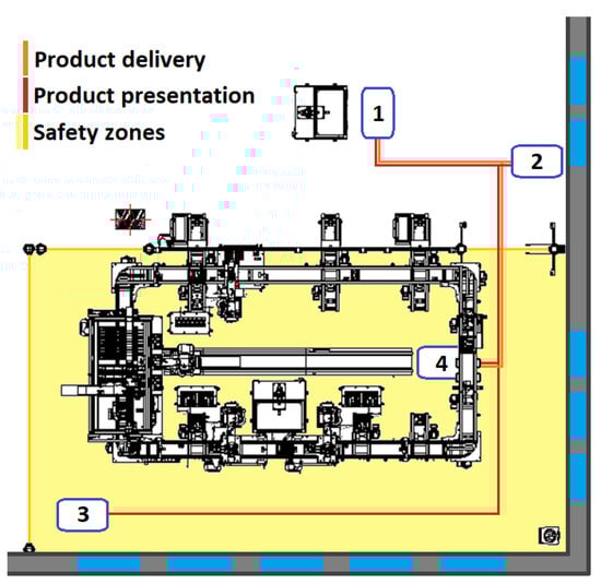 In this section, experimental delivery routes and the integration of a mobile robot into the SmartFactory production line are presented. As mentioned above, the production line produces two types of products. The production line does not contain any collection point for the final product and is surrounded by security features that prevent the possibility of entering the line. For this reason, the MiR100 mobile robot took care of the product’s journey from the line to the customer. Since the production line produced two types of products, two possible implementations were proposed.