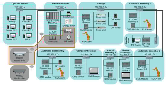 There was a local network within 192.168.0.x/24, which was used for the control systems, robotic arms, sensors, and other devices on the line. Additionally, a Wi-Fi router was used to connect mobile robots, laptops, or smartphones. Although the Wi-Fi router was part of the production line network, it was powered independently, so the mobile robot network worked even when the production line was off. See Figure 7 for more detailed information.