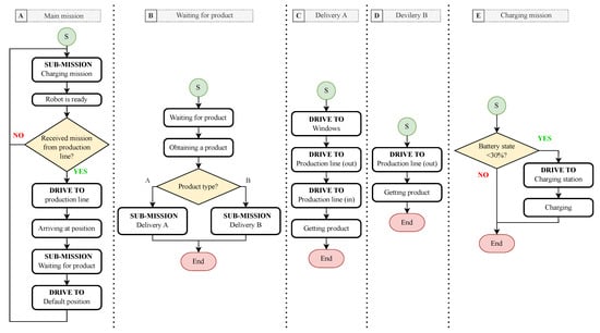 The mobile robot MiR100 had the task of communicating with the production line in SmartFactory and taking the manufactured products. According to the proposed implementation, the mobile robot took a pair of products from the line. Each pair of products had a different final delivery position, and the mobile robot had to recognize which product was currently being delivered. It received this information from the line. The mobile robot also monitored the level of the battery so that it could operate continuously and was always ready to take the product. The entire programming code was divided into five missions, where the first was the main mission, and the rest were submissions for specific actions; see Figure 8.