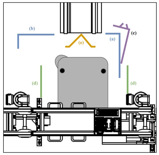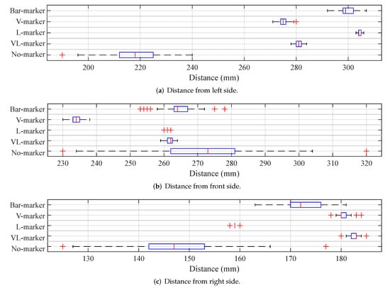 During the testing, we checked three distances. Distance between the mobile robot and the line profile on the left and right sides. The third distance checked was the distance between the robot’s front and the rail to move the robotic arm. As part of the testing of each type of marker, a total of 100 robot entrances were performed on the lines. At each attempt, the mobile robot always drove out of the line area and then back to the position in the line, possibly using a marker. The data thus obtained were represented by a box plot and basic statistical indicators. The results demonstrated the accuracy with which the mobile robot approached a given location. The distance was read using three laser range finders.