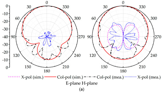 The measured and simulated radiation patterns in the E-plane and H-plane of the proposed antenna are illustrated in Figure 9. The measured results show that the antenna has stable radiation patterns with 3-dB beamwidths of 90 ± 2° in the E-plane and 88 ± 2° in the H-plane. Meanwhile, the H-plane radiation patterns have low cross-polarizations of less than −17.3 dB within the 3-dB beamwidths. There is good agreement between the measured and simulated results. The above results all prove that the antenna can have a good radiation performance.