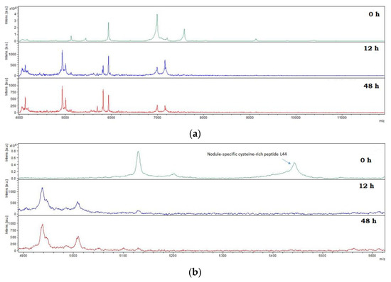 The spectra acquired with the LP2 method demonstrated that the peak of 5822 m/z was more intensive in the analyzed fermented plant material in the longer incubation period (Figure 2f). Furthermore, the degradation of the peptide from the region of about 6993 m/z (which can be attributed to the nodule-specific cysteine-rich peptide L53) and the occurrence of a new peptide (7162 m/z) in the fermented samples were detected in samples of spontaneously fermented red lentils (Figure 2g). As a result, compared to the 0 h samples, spectra obtained after fermentation indicated changes in the protein–peptide profile. The appearance of signals with a lower m/z value was most probably the result of fragmentation of higher mass peaks.