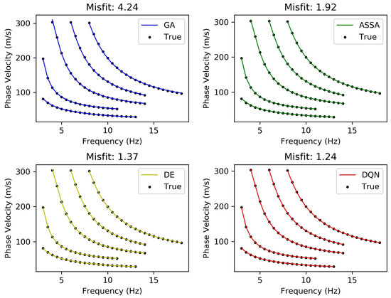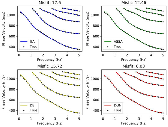 The estimated dispersion curves with the ground truth are shown in Figure 3, where the black dots are the ground truth. The blue, green, yellow, and red lines express the estimated dispersion curves by the GA, ASSA, DE, and DQN framework, respectively.