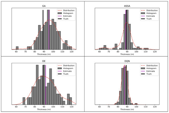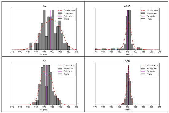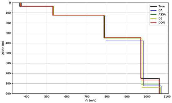 The estimated shear wave velocity profiles with the ground truth are shown in Figure 4, where the black line refers to the ground truth. The blue, green, yellow, and red lines express the estimated shear wave velocity profiles by the GA, ASSA, DE, and DQN framework, respectively.