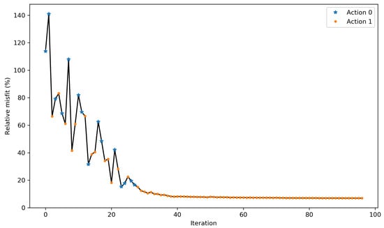 As mentioned in Section 4.2, Action 0 explores the parameter space more roughly since it compresses the search bounds in a relatively fast way. On the other hand, Action 1 is more suitable for finely exploring one local area in the parameter space. To understand the learned search strategy of the DQN framework, Figure 9 exhibits how the actions are executed by the DQN framework in an independent inversion for Case 1, where the blue star, the orange dot, and the black curve refer to Action 0, Action 1, and the relative misfit as a function of iteration numbers, respectively.