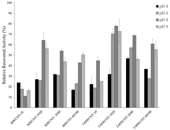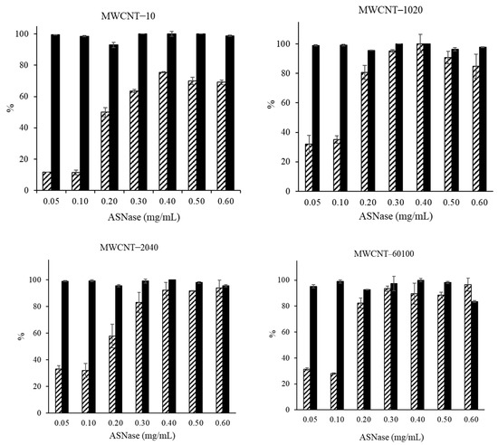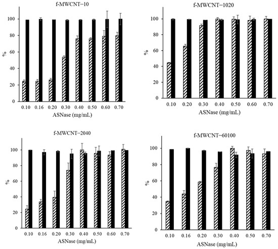 ). ASNase immobilization onto 2 mg of functionalized multi-walled carbon nanotubes (f-MWCNTs) at pH 8.0 for 30 min. Error bars correspond to the standard deviation between replicates.