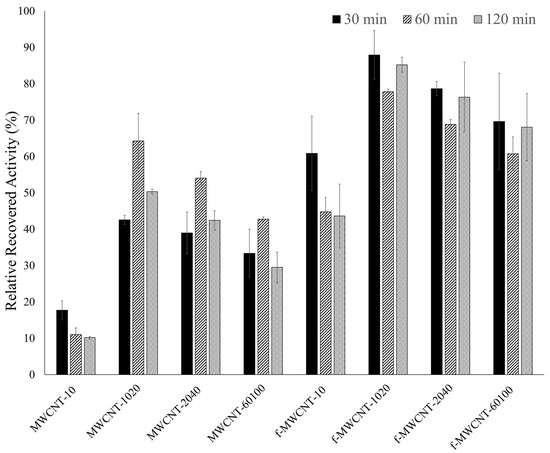 ). ASNase immobilization onto 2 mg of pristine multi-walled carbon nanotubes (MWCNTs) at pH 8.0 for 60 min. Error bars correspond to the standard deviation between replicates.
