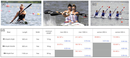 In a kayak, the paddler is seated in the direction of motion (contrary to rowing) and uses a double-bladed paddle, as presented in Figure 1a–c. Kayak races are ruled by the International Canoe Federation [1], which states that two different disciplines exist at the summer Olympics: slalom in river and sprint on flatwater. The latter is the one studied in the present paper. K1, K2, and K4 indicate the number of kayakers per boat; we present in Figure 1d the nine different events that took place in Rio-2016 with the corresponding race lengths for both men and women and the different boat sizes and minimum weights. The time of the winner is indicated in red and the corresponding mean velocity is in blue.
