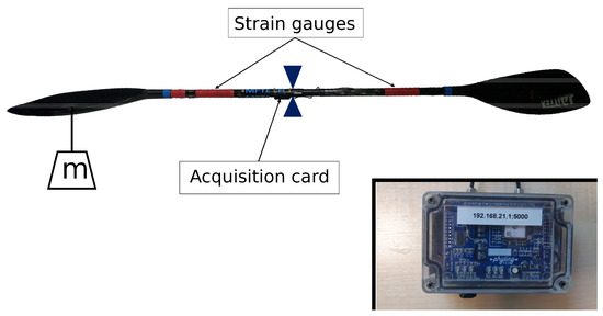 Strain gauges were placed on the paddle and linked to an acquisition card attached to the middle of the paddle (see Figure 3). The force was recorded at a sample rate of 100 Hz and the data were stored in a waterproof box MaxiPhyling placed in the boat. We used Bluetooth to connect the acquisition card and the MaxiPhyling box. In the same waterproof box, there was an accelerometer and a gyrometer, evaluating the contribution of the yaw, pitch, and roll. The data are stored on an SD card in the box. The force sensor was calibrated with calibration masses attached to the center of the immersed part of the paddle (Figure 3). Both sides were calibrated separately.