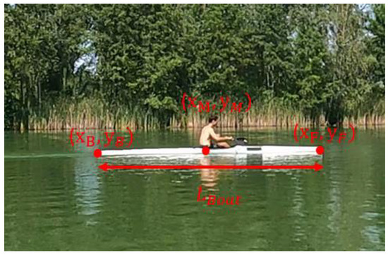 We recorded the trials via a fixed camera (GoPro) set on a tripod placed on the lake bank. The sample rate was 60 frames per second. The selected angle of view made it possible to observe 40 m of the kayak displacement on the water. We tracked both the front extremity (,) and back extremity (,) of the boat. We call M the center of the boat . All the coordinates are defined Figure 4. Knowing the boat length (in meters), we could compute the velocity as: