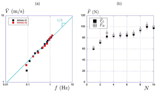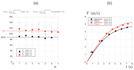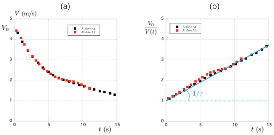 In this expression, is the characteristic time over which the velocity decreases (). The corresponding time evolution of the velocity ratio is presented in Figure 6b for Athlete A1 (black squares) and for Athlete A2 (red squares). In both cases, the theoretical affine relationship expected from Equation (5) was observed; we measure s. Thus, the velocity decreases over the characteristic time s.