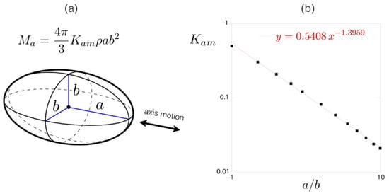As seen in Equation (2), the inertia of the kayaker and his boat did not only depend on , the sum of the mass of the kayaker , and the mass of the boat . The added mass could be estimated using the data for an ellipsoid presented in Figure 7 [17]. The volume of the ellipsoid of the long axis a and small axis b is . While moving along the large axis direction, the added mass is a fraction of the displaced mass where the constant depends on the aspect ratio as shown in Figure 7b. For a sphere () one recovers the classical result . For a kayak of aspect ratio (Athlete A1) one finds so that the added mass can be estimated to kg. Thus, the corresponding effective mass for Athlete A1 is deduced: kg. The same calculation for Athlete A2 leads to so that kg from which kg.