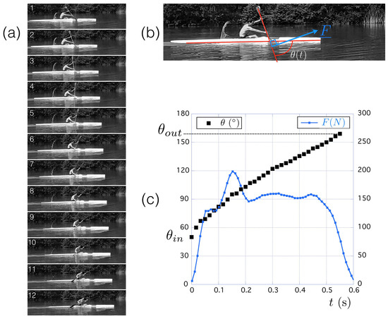 An example of a single paddling stroke is presented in Figure 8. This stroke corresponds to the third stroke after the start in the present case (see blue arrow in Figure 9). The sequence in (a) decomposes the stroke from the entrance of the paddle (image 1) to its exit (image 12). The time lapse between images was constant ( s) so the whole stroke lasted s. The angle between the paddle and the water surface is defined in Figure 8b together with the measured normal force .