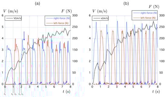 Time evolution of the velocity (solid black line with units on the left vertical axis) and the forces (solid colored curves with units on the right vertical axis) corresponding to the chronophotography presented in Figure 10. (a) Data for Athlete A1. The blue arrow indicates the cycle that is detailed in Figure 8. (b) Data for Athlete A2. The blue color is used for the force measured on the right paddle while the red color is used for the left. The quantity F is the intensity of the force exerted in the direction normal to the paddle surface.