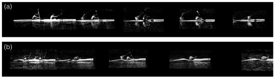 The two kayakers were asked to perform a standing start “as fast as they could” to characterize the acceleration phase. A chronophotography composed of the superposition of six pictures taken at equally spaced times is presented in [Figure 10a for Athlete A1 and Figure 10b for Athlete A2].