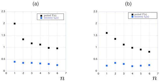 Evolution of the period T and of the recovery time as functions of the cycle number n during the two standing starts presented in Figure 9: (a) Athlete A1, (b) Athlete A2.