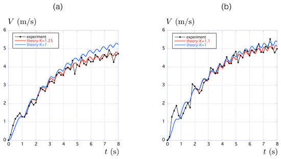 For the standing starts presented in Figure 9, this equation was solved with the initial condition together with the measured force . The paddling dynamics are accounted for via the entrance () and exit angles () together with the corresponding instants ( and ). In the above Equation (6), we also introduced a constant in front of the total drag in order to account for the increase in the drag associated with the perturbed motion of the boat (surge, heave, sway, pitch, yaw, roll) that appeared once paddling started [1,20]: an active drag coefficient.