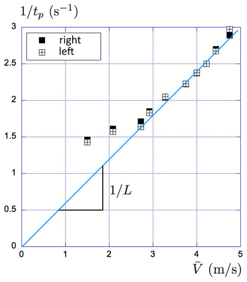 At this stage, we need to find an expression for the evolution of as a function of the velocity . The ratio between the hydrodynamic coefficients of the boat and the paddle is small ( m for the boat and m for a paddle). For this reason, we expect little drift of the paddles in the water compared to the boat during the propulsion. In the limit where the paddle is anchored in the water, the velocity of the paddle in the frame of the boat equals the velocity of the boat . Defining as the length of the propulsive path of the paddle in the frame of the boat, it comes . Therefore, the relationship between and should be close to . We used the data of the 10 × 50 m of Athlete A1 to analyze the evolution of the inverse of the propulsion time and the mean velocity (Figure 15).