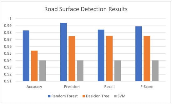 Accuracy, precision, recall and F-score for road surface conditions results.